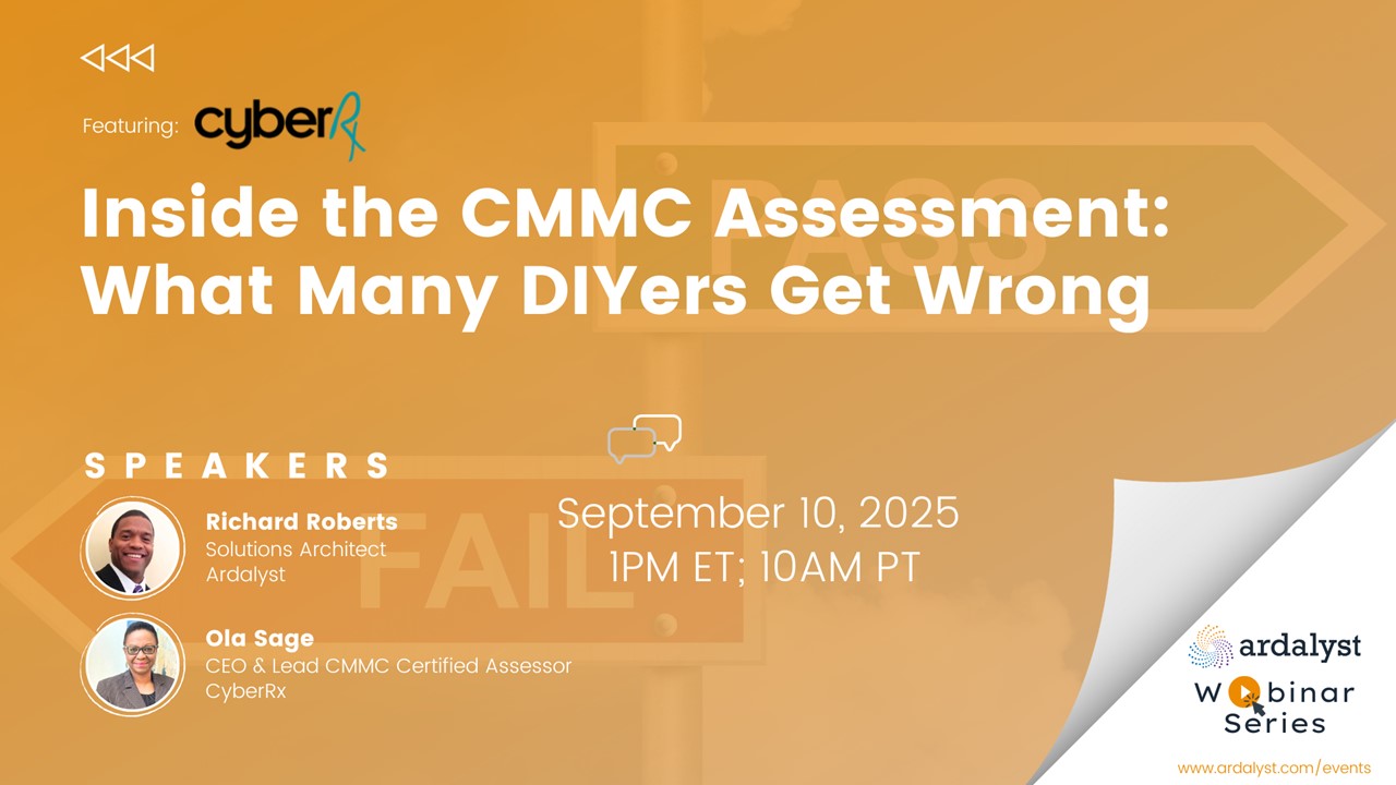 In Inside the CMMC Assessment: What Many DIYers Get Wrong, Ardalyst and CyberRx shared why DIY compliance efforts often fail and what assessors really look for. Attendees walked away with lessons on pitfalls, scoping, documentation, and how to prepare with confidence.